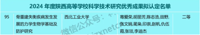 近日,陕西省教育厅发布了《2024年度陕西高等学校科学技术研究优秀成果拟认定名单》,全省共评出优秀成果429项,骞爱荣教授团队科研成果《骨重建失衡疾病发生发展的力学生物学基础及防护研究》荣获二等奖。