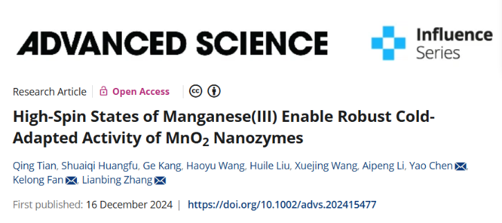近日英国正版365首页官网张连兵教授团队在国际知名期刊《Advanced Science》上发表题为“High-spin States of Manganese(III) Enable Robust Cold-adapted Activity of MnO2 Nanozymes”的研究论文。受天然氧化酶借助高自旋态过渡金属实现温和高效氧化反应的启发,以锰氧化物为材料模型,通过价态与自旋态的调控,成功构建出在-20-45℃宽温域具有稳定催化性能的MnO2适冷纳米酶。