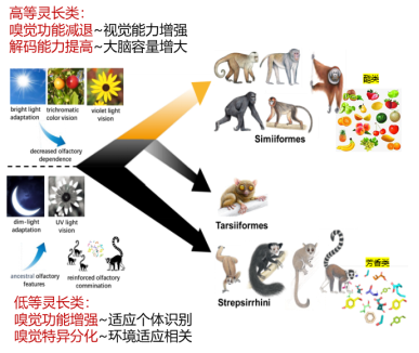 图1. 灵长类视觉与嗅觉感官演化的“重新分配”模式
