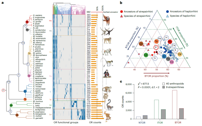 在灵长类动物演化和辐射中,其视觉和嗅觉的发展通常被认为是以彼此为代价的,存在一种视觉和嗅觉强弱之间权衡。这种关于视觉和嗅觉功能之间的“权衡”是否存在的争论可以追溯到18世纪最早的关于灵长类演化的进化研究,直至今天。该论文对现生灵长类动物的视觉和嗅觉受体以及相关脑区进行了大规模的功能分析,并预测和分析了各祖先演化节点的受体功能,从而深入探索这一科学问题。该研究通过多系统分析揭示了基因组、分子和神经解剖学特征的共同进化模式,并提出了灵长类感官演化为“重新分配”这一模式更为准确,而不是视觉和嗅觉之间简单的此消彼长的制衡关系。这些发现意味着哺乳动物的感官演化比我们以前所知道的要复杂得多。