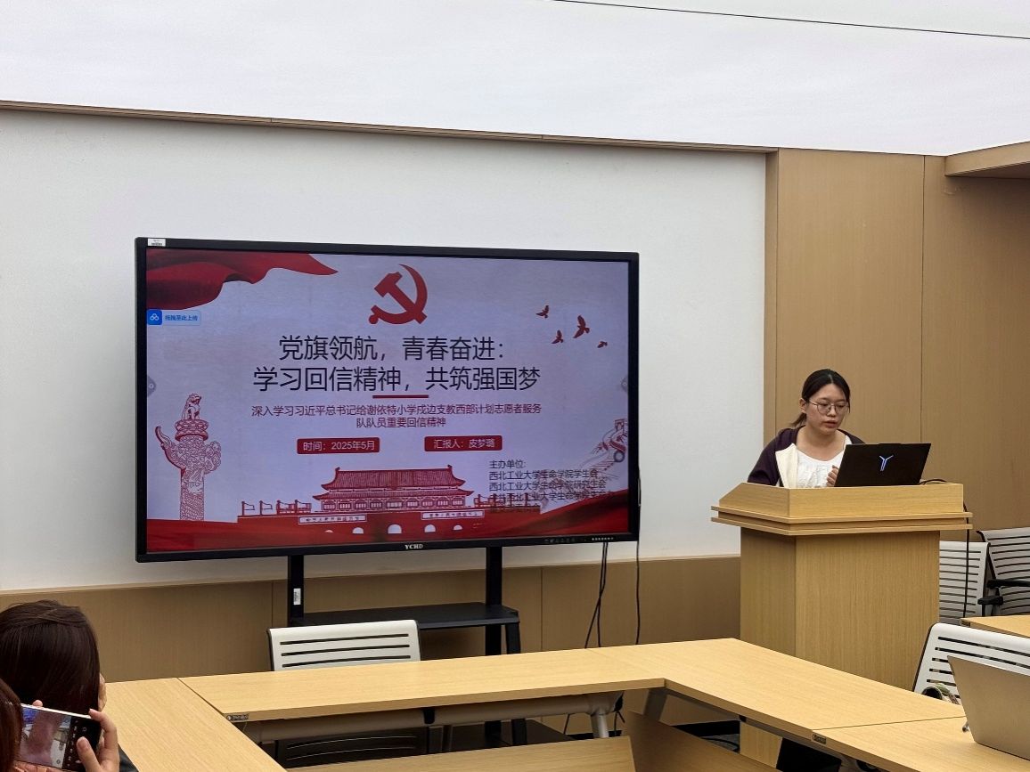 活动紧扣回信精神,围绕“坚定理想信念、厚植家国情怀、练就过硬本领、发扬奋斗精神”展开。首先,皮梦璐同学深度解读《回信》内容,提炼关键精神,《回信》引导青年将个人理想融入民族复兴伟业。接着,她分享了许多青春榜样事迹,从不畏艰苦在边疆支教的志愿者,到投身乡镇就业服务、在反诈一线守护百姓的青年,再到科研领域勇攀高峰的团队,激励同学们以榜样为指引,积极投身强国建设。最后,大家一起探讨了如何将回信精神转化为实际行动,坚定信念、锤炼品德、苦练本领、实干担当,以强国有我的信念奉献青春力量。