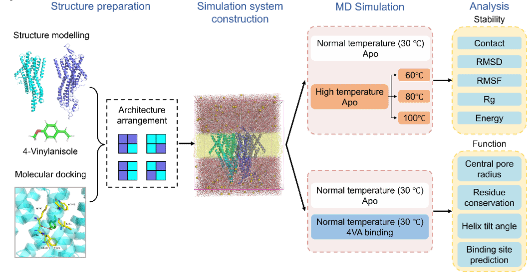 研究发现,化学计量比为1:3的OR与Orco组合(即1OR:3Orco)是其结构最稳定的构型,该构型在高温环境下仍能维持较低的主链波动与势能,显示出更高的热稳定性。此外,我们还模拟了4种构型(1OR:3Orco、3OR:1Orco、对侧与同侧2OR:2Orco)结合配体分子(信息素4-乙烯基苯醚,4VA)的MD过程,并在此基础上提出了两种气味受体激活的分子机制:类对称通道开放和非对称通道开放模式。本研究比较了1OR:3Orco、2OR:2Orco(两种构型)与3OR:1Orco四种不同异源构型的稳定性和功能响应机制,为理解气味受体离子通道的分子调控机制提供了重要线索。我们还进一步通过对关键残基的分析,识别出一系列调控通道开启与配体识别的功能位点。
