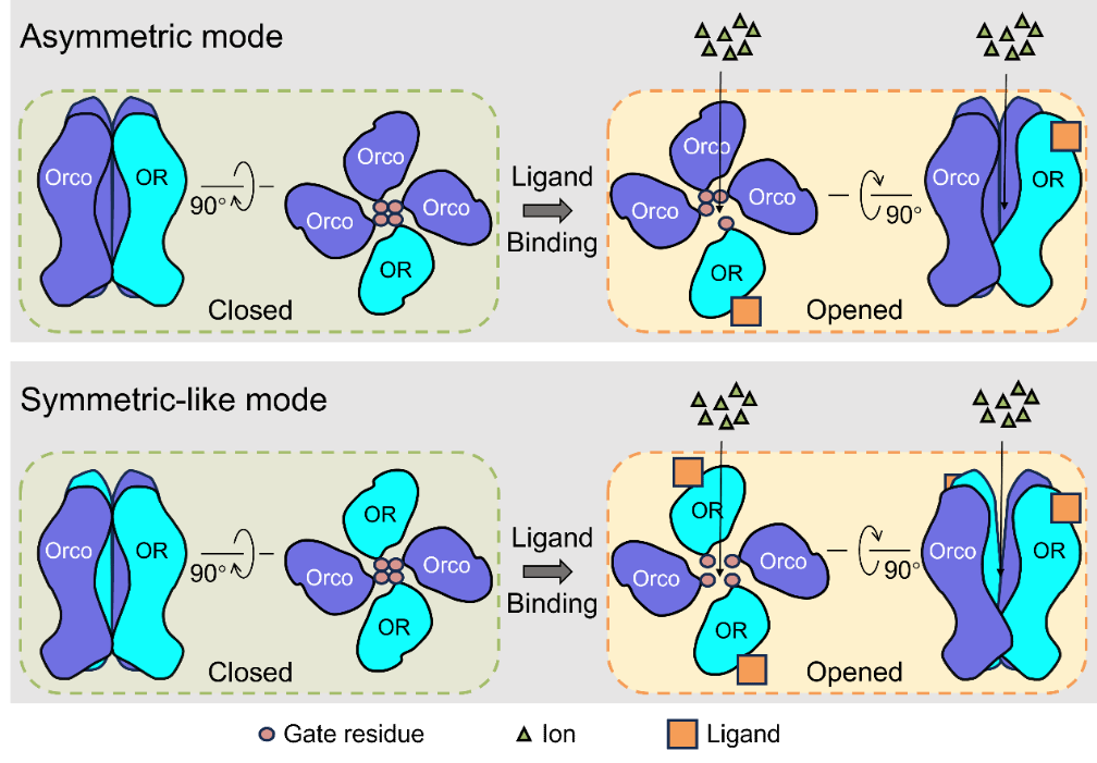 图3.本研究揭示出OR-Orco异四聚体的两种通道开启机制