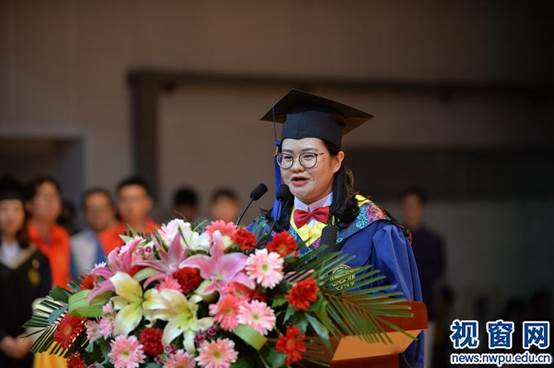 我院李思宇同学代表2018届全体毕业研究生在典礼上发言。她代表全体毕业生感谢母校和老师们的悉心培育,她的发言充满了对母校、老师和后勤工作人员的感恩。“将传承西工大精神,勇担时代重任,奋力拼搏,让青春年华焕发出更加绚丽的光彩!将发扬‘三实一新’校风,强健身心体魄,开拓创新,为实现中华民族伟大复兴的中国梦而努力奋斗!”她在向母校郑重承诺的同时,祝福母校在建设世界一流大学的征程中,不断创造新的辉煌!