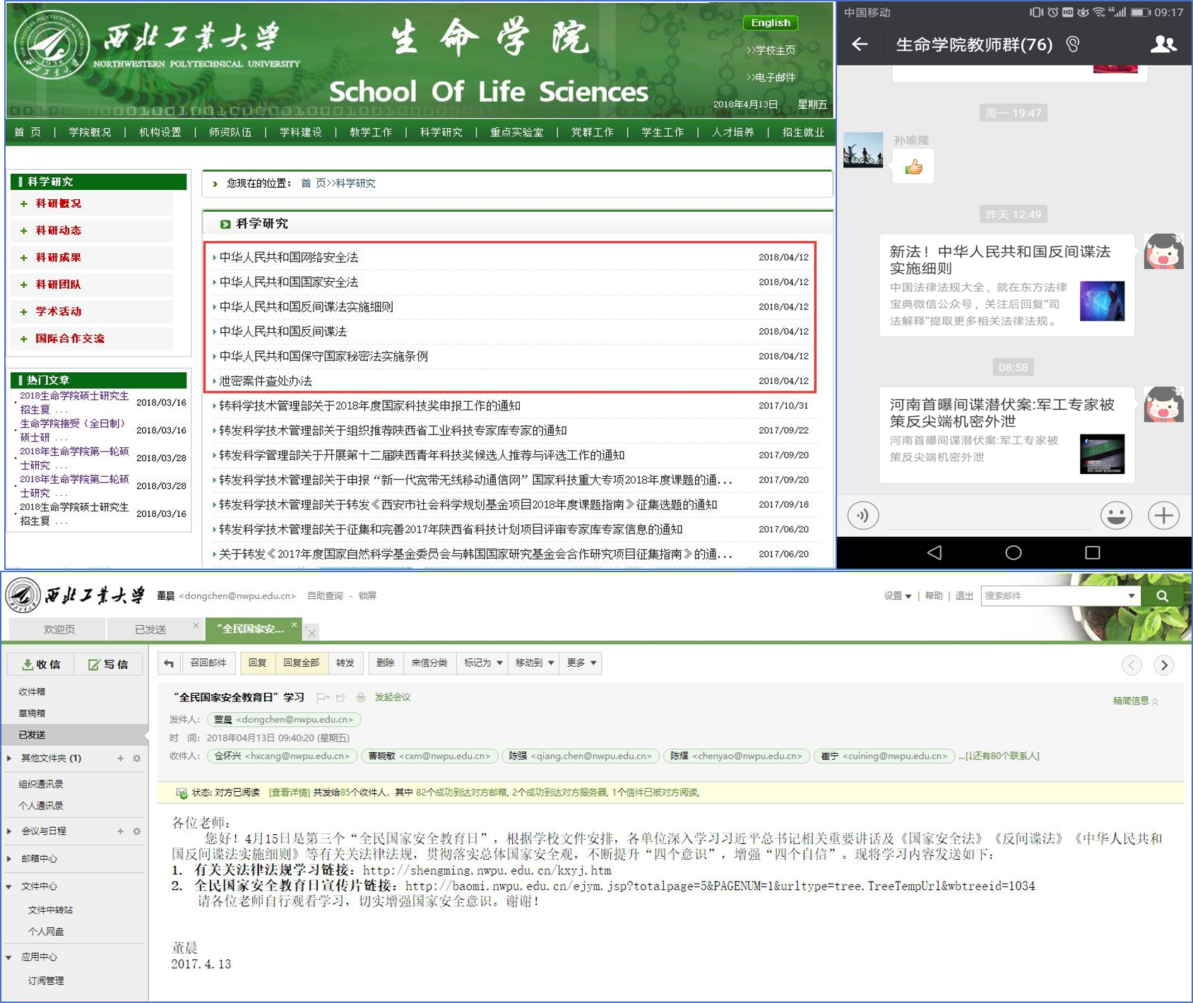 学院结合工作实际,组织职工进行相关视频文件的学习,并在学院网站和微信群等公共平台上,进行《国家安全法》、《反间谍法》、《中华人民共和国反间谍法实施细则》等国家安全相关法律法规的宣传。