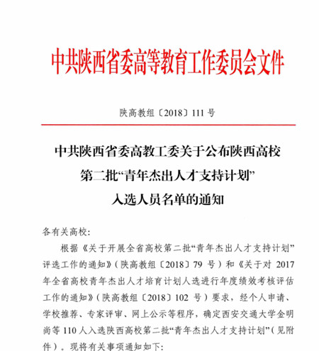 根据《中共陕西省委高教工委关于陕西高校第二批“青年杰出人才支持计划”入选人员的公示》,我院侯海副教授连续两届入选陕西省高校“青年杰出人才支持计划”。