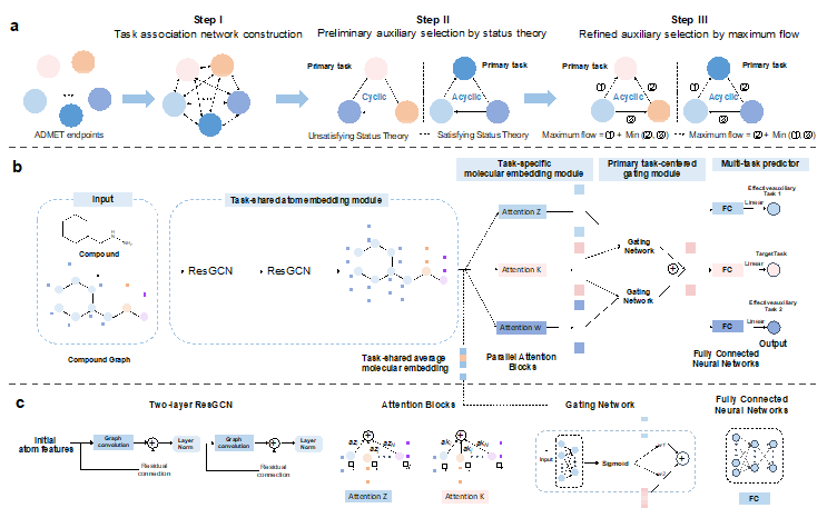 论文基于状态理论和最大流策略提出了一种新颖的多任务学习框架,即MTGL-ADMET(图3),以筛选有效的正向辅助任务来共同训练目标任务并优化辅助任务的贡献。MTGL-ADMET包括特定任务的分子特征模块、以主要任务为中心的门控模块及任务预测器模块。利用基于有效辅助任务的关系,设计基于多任务的的图神经网络,研究基于吸收、分类、代谢、排泄及毒性预测方法,探索化合物子结构与ADMET的关联规律,它可以促进候选药物筛选或药物设计的发展。