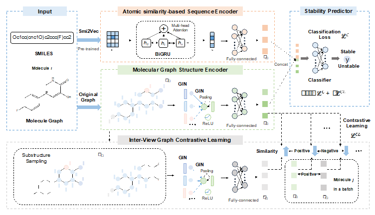 为了解决这些问题,本研究提出了CMMS-GCL模型,这是一个跨模态图对比学习方法,用于预测药物候选物的代谢稳定性。该模型结合了SMILES序列数据和分子图数据的深度学习技术,提出了一种新颖的方法来从两种不同的数据形式中提取特征,并通过图对比学习来进一步增强分子图特征。CMMS-GCL包含基于原子相似性的序列编码器、分子图结构编码器、图对比学习以及稳定性预测器(图1)。CMMS-GCL模型在多个数据集上的测试结果表明,它在预测准确性和解释性方面均优于其他先进方法,为药物发现和候选物的筛选提供了新的工具。