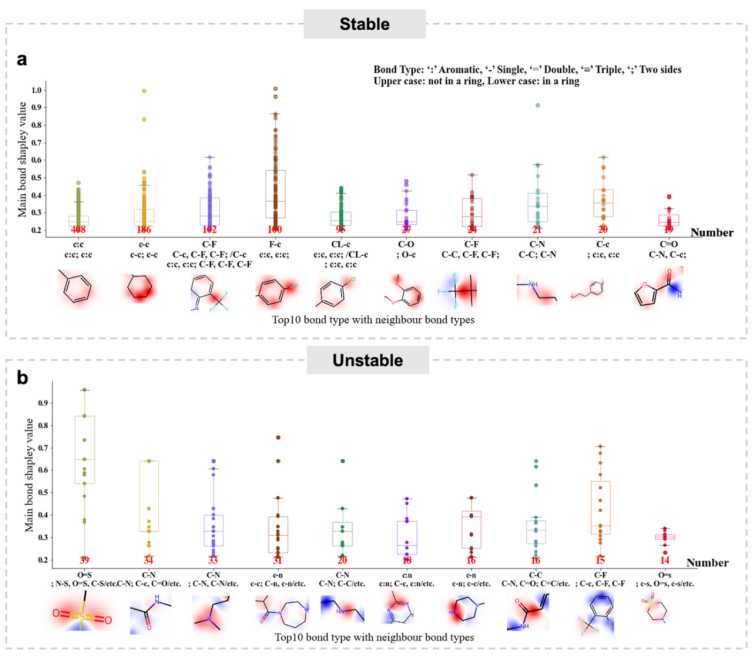 统计性分析部分对CMMS-GCL模型进行了深入的可解释性评估。本研究通过分析模型识别的关键官能团,并将这些官能团与已知的药物代谢数据库进行比对,来验证模型的预测准确性。分析结果表明,CMMS-GCL不仅能够准确预测代谢稳定性,而且能够清晰地指出哪些化学结构特征对代谢稳定性起着决定性作用。此外,模型还能够揭示出分子的哪些特定部分与药物代谢过程中的关键酶相互作用,从而进一步加深了对药物代谢机制的理解。这项统计性分析为CMMS-GCL模型的解释能力提供了强有力的证据,并为未来的药物设计和优化提供了有价值的指导。