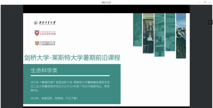 办公室主任曹懿从项目收获、项目亮点以及文化调研体验几个方面对英国剑桥大学-莱斯特大学生命科学项目进行了详细的介绍和解疑。往期优秀学员代表张晗钰分享了参加项目的体验感想和收获、金宏同学介绍了办理签证的注意事项,并寄语学弟学妹把握机会,在做好学业规划的基础上,积极参与国(境)外交流项目。