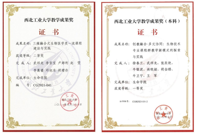 经过教学实践和总结,武祥龙老师为第一完成人的“三维融合式生物医学类一流课程建设与实践”获得2021年英国正版365首页官网教学成果奖二等奖;以第二完成人参与实施“创教融合·多元协同:生物技术专业课程群教学新模式的探索与实践”获得2023年英国正版365首页官网教学成果奖一等奖。