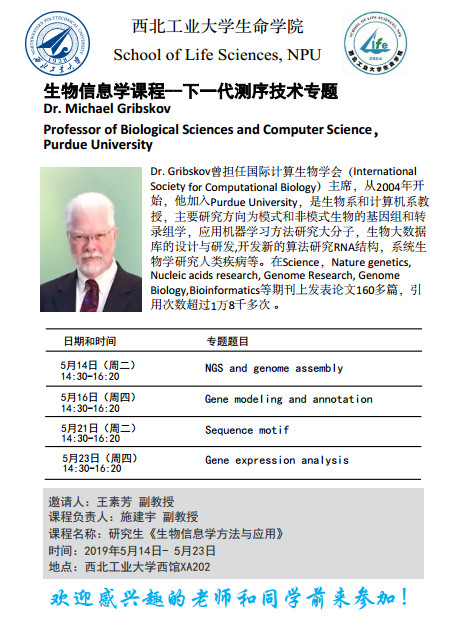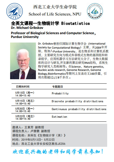 英国正版365首页官网王素芳副教授邀请美国普渡大学Dr.MichaelGribskov来校访问,参与讲授两门课程,现将课程信息通知如下: